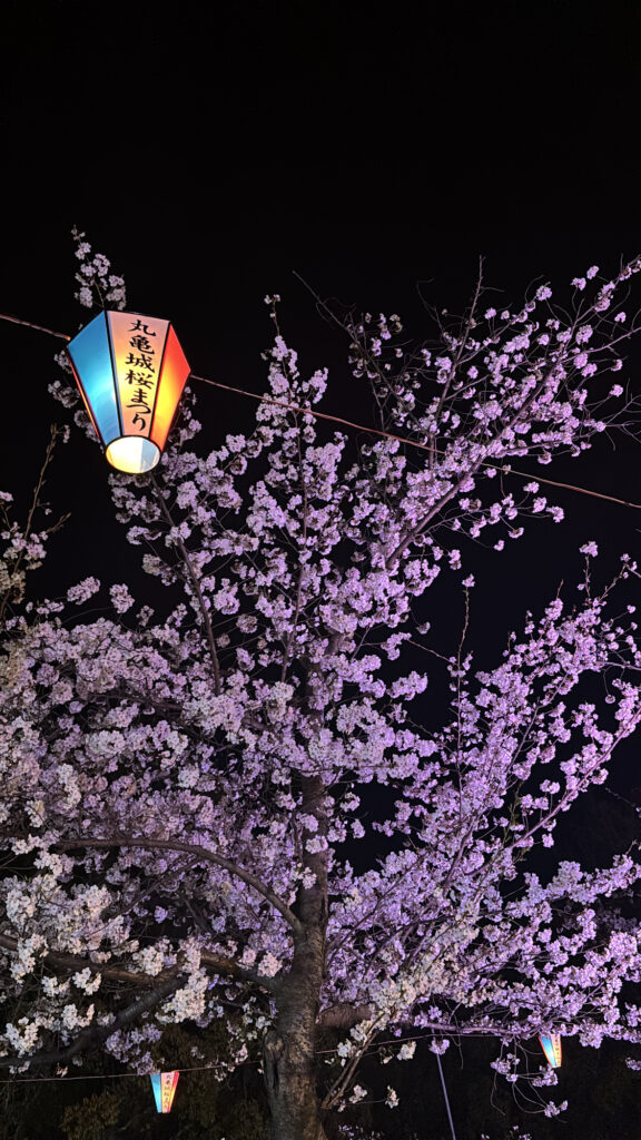 桜がピンク色に丸亀城が青色にライトアップされていてすごく綺麗でした!